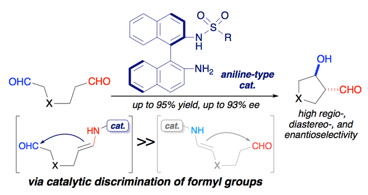 アニリン性酸塩基触媒が非等価なホルミル基を見分け、位置、立体選択的な分子内不斉交差アルドール反応を触媒する。